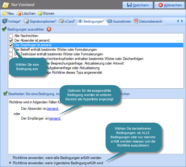 Es muss mindestens eine Bedingung festgelegt sein, damit Signaturen angewendet werden. Wird eine Bedingung nicht ausgewählt, wird die Standardbedingung von Alle Nachrichten verwendet. Auf der Seite Bedingungen - Optionsübersicht erhalten Sie eine Übersicht zu den verfügbaren Bedingungen. |