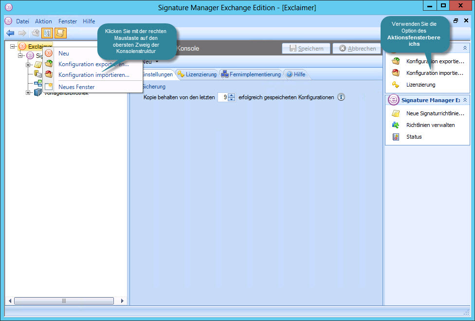 Einstellungen müssen von einer econfig-Datei importiert werden; hierbei handelt es sich um einen proprietären Dateityp für Exclaimer-Produkte, der erstellt wird, wann immer die Option Konfiguration exportieren verwendet wird. So importieren Sie Konfigurationseinstellungen:
